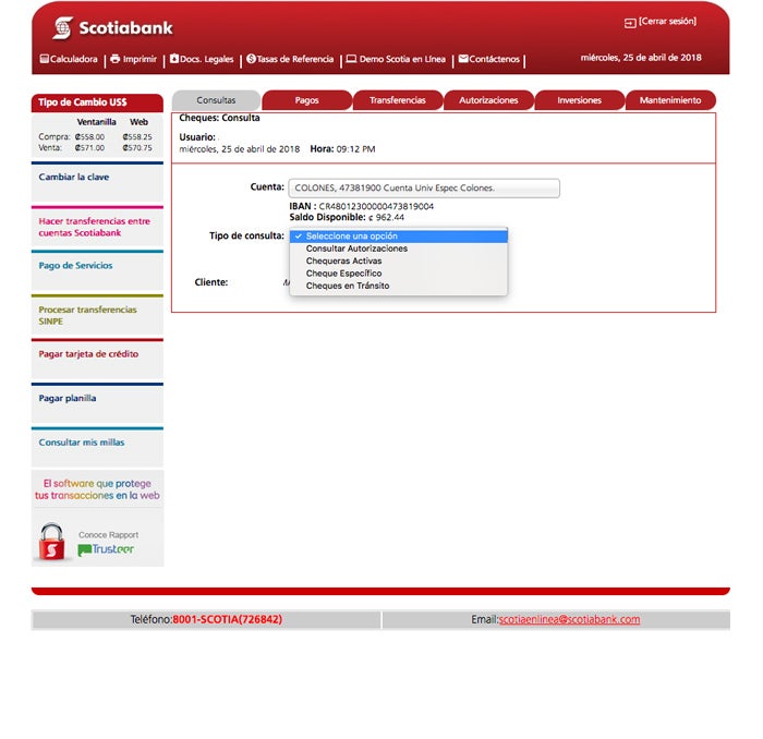 1. Seleccione la cejilla de “Cheques” dentro de la opción de consultas, seleccione el número de cuenta que desea revisar los valores en tránsito que posee en ese momento.