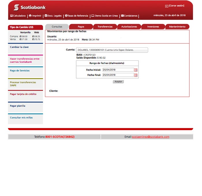 1. Seleccione la cejilla de “Movimientos” dentro de la opción de consultas, seleccione el número de cuenta que desea consultar, además debe de ingresar el rango de fechas de los movimientos que desea verificar. Haga clic en “Aceptar”.