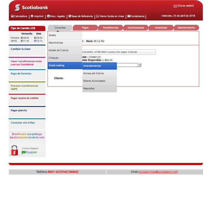 1. Seleccione la cejilla de “Scotia Leasing” dentro de la opción de consultas, seleccione la opción de “Arrendamientos” para realizar su consulta: