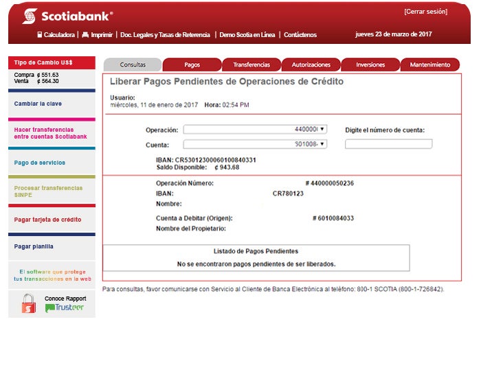 1. Ingrese a la cejilla “Liberar pagos”, seleccione el número de operación y la cuenta desde la cual realizó el de las operaciones de crédito. El sistema le desplegará los pagos pendientes para ser liberados.
